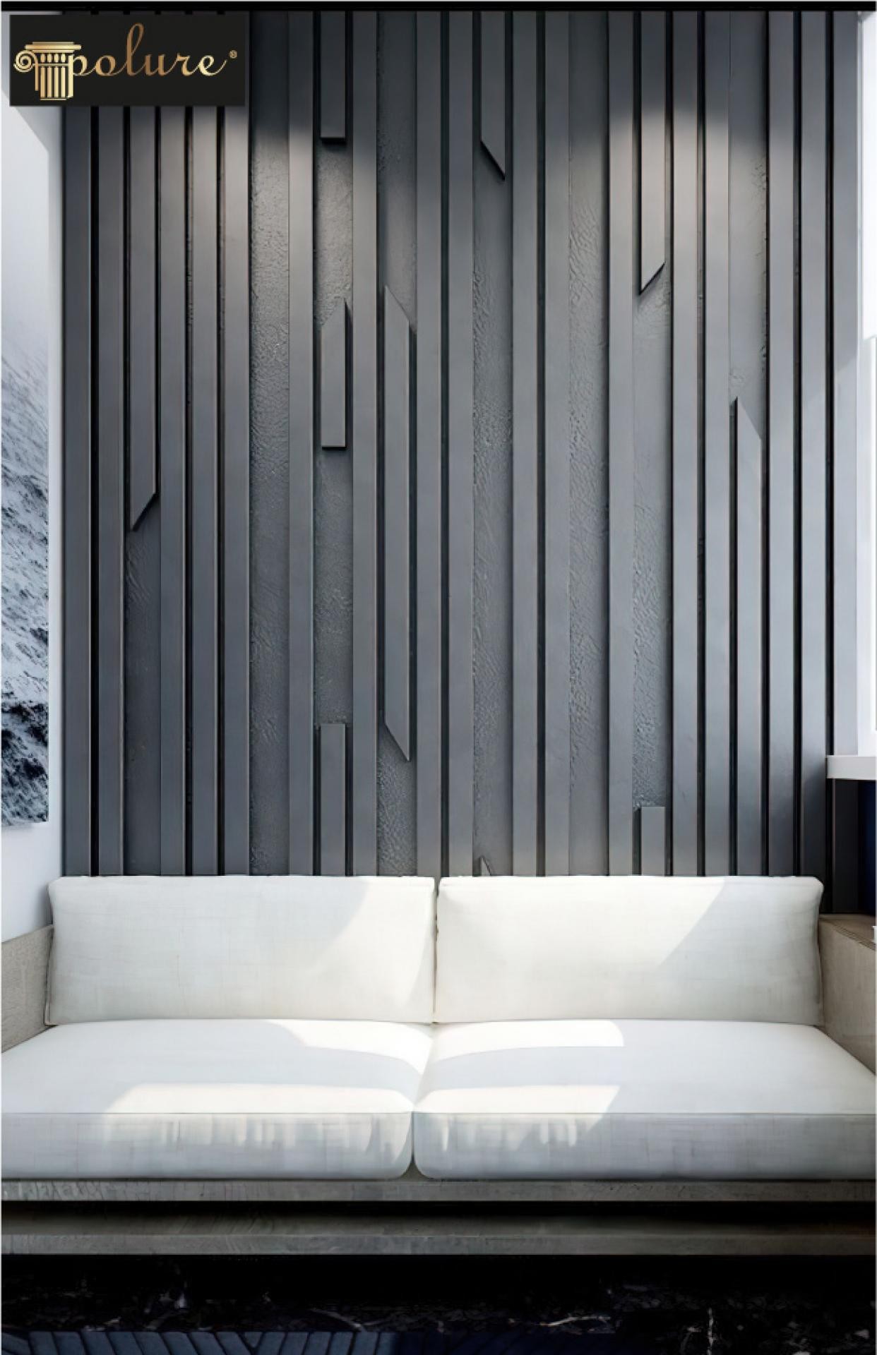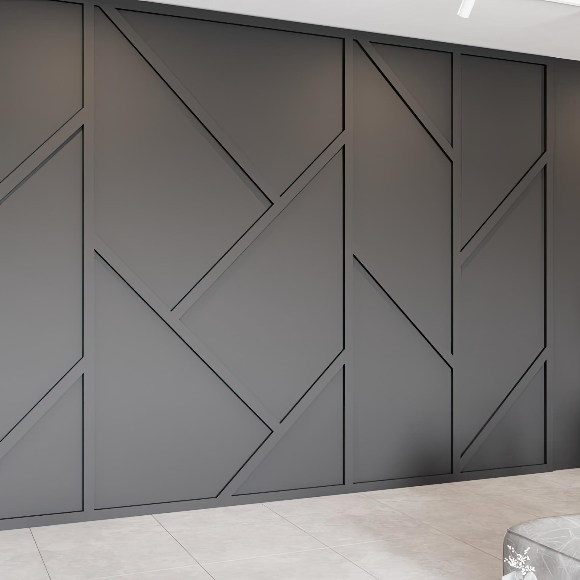 Modern-classic balance with polyurethane geometryThe use of polyurethane panels provides a versatile design approach that allows interior walls to gain texture and depth without being overwhelming. In this living space, the wall is finished with dark-toned polyurethane sections cut into bold geometric motifs. These linear divisions form irregular angular compositions, resembling abstract patterns that not only capture attention but also draw light and shadow play across the room.The overall atmosphere is enhanced by the contrast between the rigid wall design and the soft surfaces of the rug and seating. The neutral ceramic tiles provide a stable foundation, giving the striking wall design the stage it deserves. Integrating such detailed reliefs into interiors adds a sense of modern-classic identity by reflecting both the precision of modern minimalism and the grandeur of classical symmetry.Design details and historical notesPolyurethane’s versatility has modern parallels with historical decorative plasterwork used in classical architecture, such as Greek and Roman interiors where surface relief created visual rhythm. The angular composition here reinterprets that heritage with a more industrial, contemporary stance. By combining historical inspiration with innovative material application, the design achieves a sophisticated balance.Dark wall tone highlights structural precision.Diagonal and angled lines offer abstract dynamism.Polyurethane material provides lightweight durability.Contrasting surfaces maintain visual harmony.This approach to wall treatment demonstrates how decorative surfaces can become the main element of spatial identity, while still coexisting with comfort-driven modern furniture arrangements. The living room showcases a bold reinterpretation of polyurethane wall cladding. Diagonal and angular motifs provide rhythm, giving walls a sculptural depth. The design balances modern clarity with classical proportions. Soft textures like a plush rug offset the strong surfaces. This harmony results in a room that feels both open and luxurious. The geometry frames light and shadow dramatically. Grey tones accentuate linear symmetry while remaining neutral. Historical references subtly link to classical surface relief. The space embodies a timeless decorative structure. High-quality wall detailing adds architectural presence. Polyurethane proves both lightweight and resilient. The wall composition anchors the room as a focal point. Contrasts highlight sophistication in the overall scheme. A blend of heritage and contemporary style permeates the space. Every panel line offers visual texture without clutter.