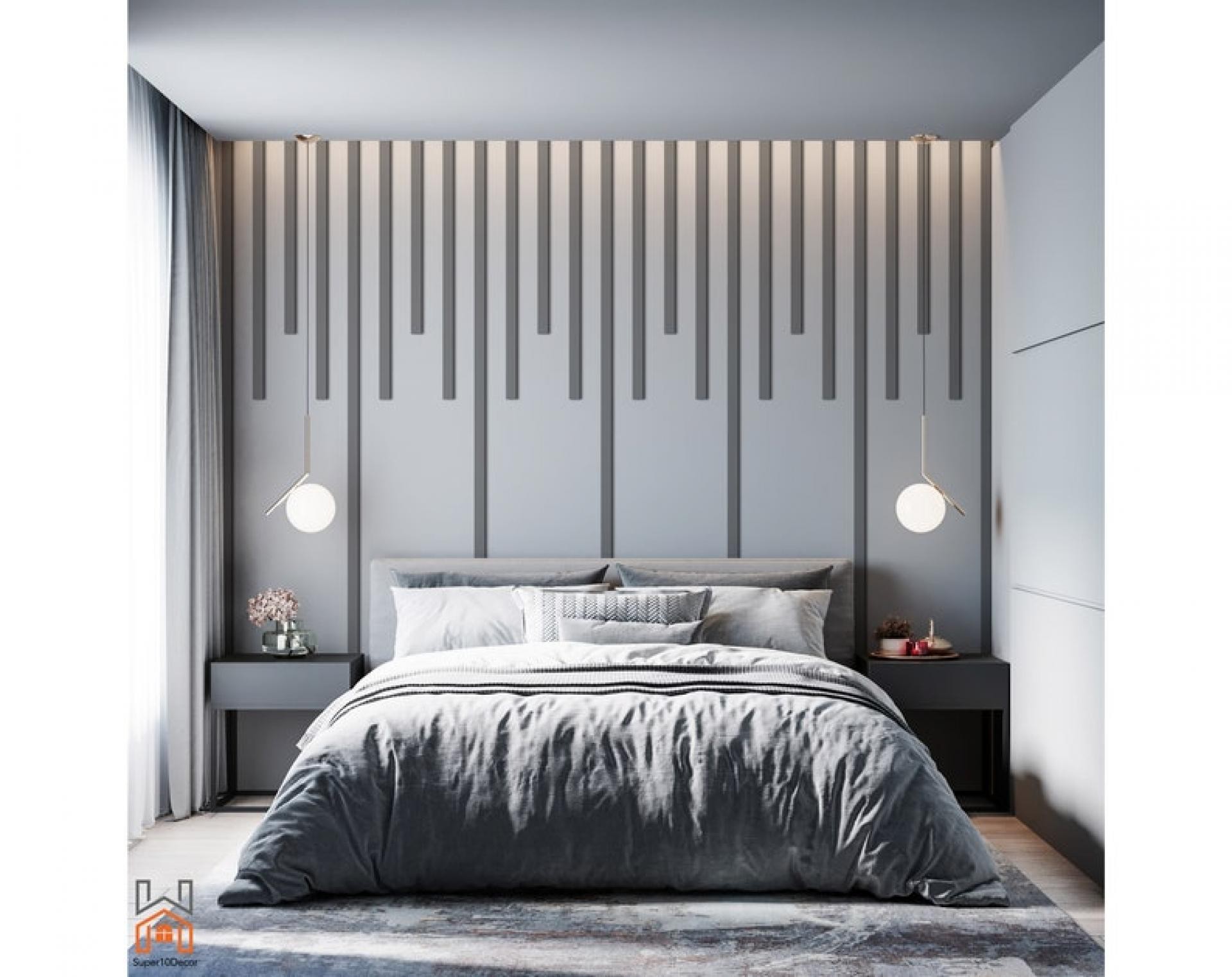 Modern classic bedroom with polyurethane wall panels and geometric textures