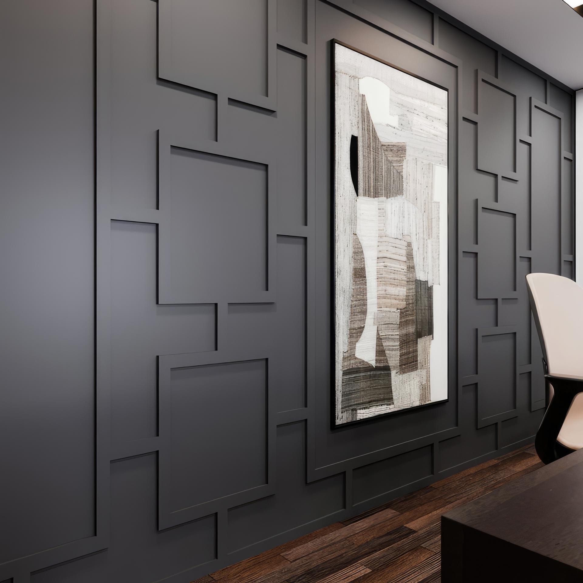 Polyurethane Wall Molding for Modern Classic InteriorsUsing polyurethane wall molding brings a refined sense of structure to living rooms that seek a balance between tradition and contemporary character. The design involves modular, interlocking panels built into geometric patterns of rectangles and squares, creating a sense of depth and precision. This careful arrangement echoes classical framing techniques while being executed with modern materials, resulting in a high-impact surface treatment that remains lightweight and durable.The wall surface finished in a deep gray shade enhances the sharpness of the borders, allowing the geometric layout to stand out clearly under subtle lighting. Within this textured canvas, abstract artwork composed of layered neutral tones draws the eye and offsets the rigidity of the background with soft, organic contrasts. This interplay embodies the true spirit of a modern classic room—where order meets creativity.Historical Inspiration and Design NotesThe concept of wall framing can be traced back to classical European halls, where ornamental plaster and timber molding defined spaces with balanced proportions. Modern design reinterprets these motifs through polyurethane, which makes intricate profiles accessible while reducing installation effort. The use of strict linear forms recalls Bauhaus geometry, merging functionality with aesthetic discipline.Complementing the wall are dark wooden floors, adding warmth and grounding the visual effect. Sleek furniture reinforces the contemporary side of the style, ensuring that the decorative panels remain the focal point of the room.Create rhythm through repeating square and rectangular motifs.Balance bold wall geometry with neutral artwork.Use lighting to emphasize depth and shadow play. This modern living room embraces polyurethane molding as a fusion of tradition and minimalism. The deep gray surface is enriched with structured rectangular and square patterns that establish visual rhythm. Abstract wall art softens the rigid composition with layered tones. The geometric motif becomes a practical guideline for modern classic styling. The wooden flooring adds organic warmth beneath the crisp wall relief. Sleek furniture ensures harmony without overcrowding the scene. Decorative profiles in polyurethane keep installation accessible and durable. The overall style celebrates balance between timeless order and modern flair. Shadows created by recessed lines add dynamic texture. A neutral palette enhances spatial depth. The combination of structural molding and artwork highlights aesthetic versatility. The design reflects echoes of classical framing heritage. It creates a backdrop suitable for both art and furniture. The composition ensures coherence across contemporary interiors. Subtle lighting further defines the modern classic aesthetic.