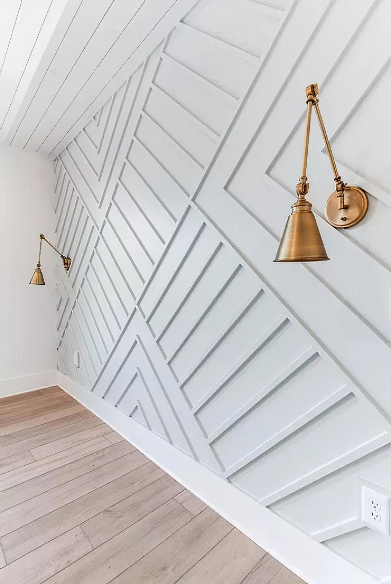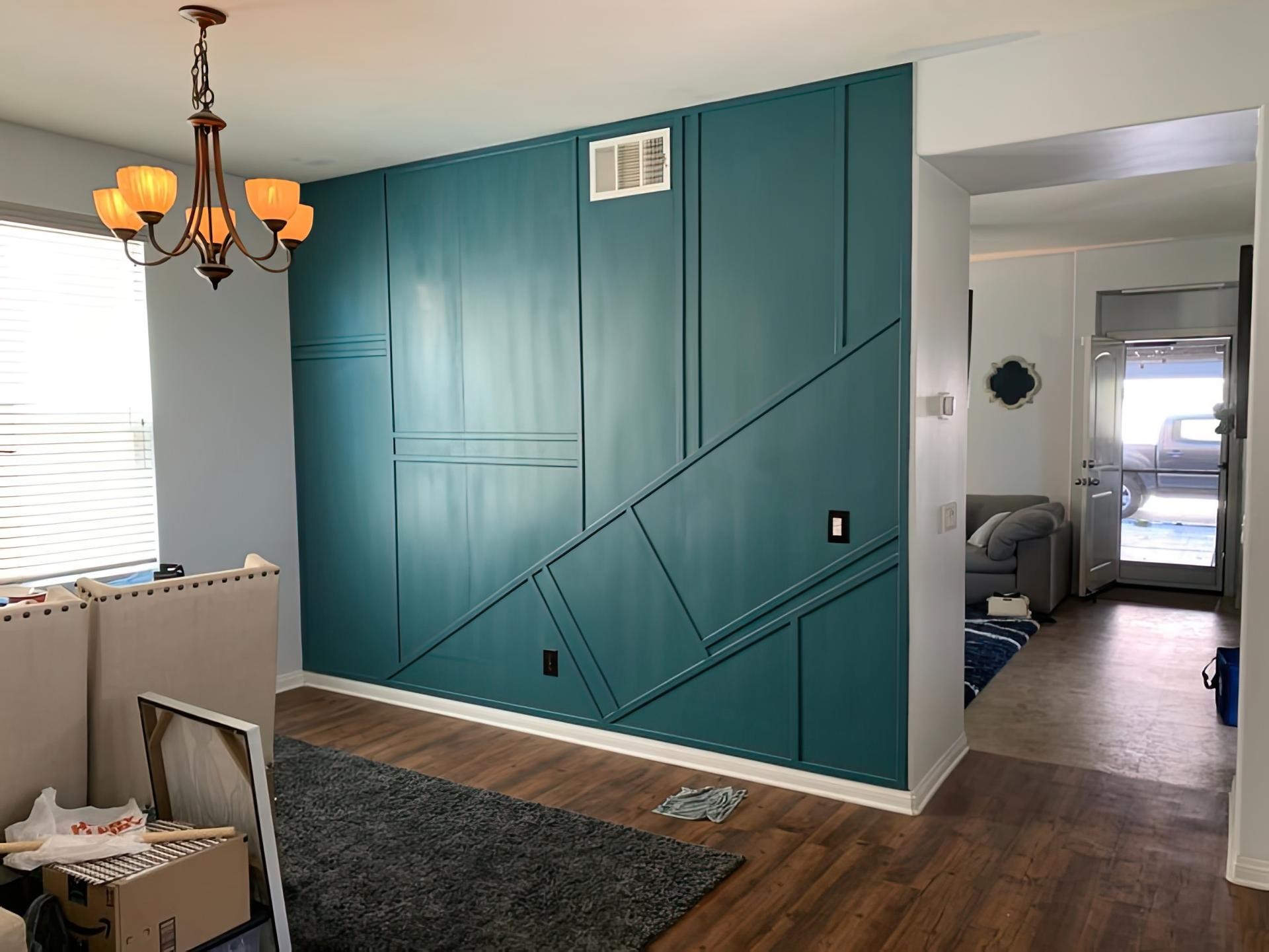 Asymmetrical Polyurethane Accent WallA modern living room can be transformed by the use of polyurethane trim applied in an asymmetrical arrangement. In this design, diagonal lines intersect with vertical and angled cuts, forming triangular and trapezoidal sections that bring a sculptural presence to the wall.The deep blue paint highlights the structural relief of the trim, while the geometric patterns create a sense of movement across the surface. Unlike uniform paneling, the irregular division of shapes adds rhythm and energy to the room, making it both sophisticated and visually engaging.Polyurethane has been favored in decorative arts since the mid-20th century for its adaptability and durability. Its ability to be painted in any shade allows designers to customize walls to match both modern and classic interiors. The design here demonstrates a contemporary interpretation of traditional wainscoting, where historical use of molds and trims has been reimagined with bold asymmetry.Such an accent wall works effectively in living areas, behind sofas, or as a backdrop for media units, establishing a focal point that speaks to both timeless elegance and modern innovation.Rich matte color enhances light and shadow playAsymmetrical arrangement resists predictabilityPolyurethane ensures long-lasting precision linesVersatile design complements varied furniture styles This modern accent wall uses polyurethane trim arranged in diagonal and asymmetrical patterns to create a bold statement. The intersecting lines form triangular and trapezoidal shapes that stand out as a geometric feature. Its deep matte blue paint enhances the contrast between flat and raised areas. The composition adds a unique rhythm to the living room without overwhelming the space. Asymmetry makes it more dynamic than traditional wall paneling. The use of polyurethane ensures durability and sharp detailing. Its design reflects both modern and classic styles at once. Such walls are ideal for creating a dramatic yet timeless look. The structured lines naturally guide the eye across the room. The tactile feel gives the wall a sculptural quality. This combination makes it an attractive choice for contemporary interiors. By avoiding repetitive shapes, the design offers subtle complexity. The blue tone enriches the serene atmosphere. Overall, this accent wall successfully merges artistic geometry with practical function.