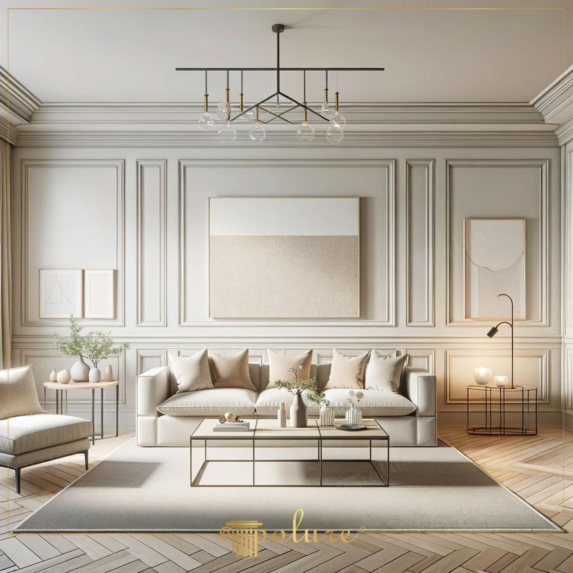 Minimal Modern Classic Living Room DesignIn this interior, polyurethane wall molding provides a delicate yet structured frame that defines the rhythm of the walls. The panels are composed of rectangular and square modules, adding precise geometry while maintaining a sense of classic refinement. This use of polyurethane molding balances durability with aesthetic detail, enhancing the room without heavy ornamentation.The space features soft ivory walls contrasted by subtle metallic accents that highlight clean linear motifs. A modern chandelier with spherical bulbs hangs centrally, introducing playfulness that contrasts with the classical symmetry of the wall panels. Together, these forms create the essence of modern classic balance.The parquet flooring is laid in a distinctive herringbone pattern, introducing repetition and rhythm that gently contrasts against the rectilinear wall design. Its natural wood tones enrich the otherwise pale color palette, grounding the room in warmth. Historically, herringbone arrangements date back to Roman times, making it a fitting complement to the neoclassical detail on the walls.The furniture arrangement follows a minimalist approach, featuring streamlined sofas with neutral upholstery, a round coffee table with a golden metal frame, and side tables with delicate bases. Decorative touches such as pampas in textured vases and manicured greenery bring organic softness to balance the rigidity of the paneling.Rectilinear wall motifs with polyurethane framesSoft beige and ivory cushioned seatingGold-lined furniture bases and lighting fixturesClassic chandelier with structured spherical bulbsBalanced composition of symmetry and comfortOverall, the design demonstrates how minimal classic interiors can merge historical inspiration with modern restraint, creating a timeless living environment. This interior exemplifies the fusion of minimal modern and classic design. Polyurethane wall molding defines each surface with geometric precision. The balanced paneling merges elegance with clarity. Soft ivory tones dominate the background. Metallic gold accents highlight edges subtly. A striking modern chandelier reinforces symmetry. The composition feels airy and harmonious. Furnishings are neutral and cohesive. The herringbone parquet enhances warmth. Geometric motifs enrich the design. Organic plants soften the straight lines. Decorative accents offer calm sophistication. Historical cues meet contemporary lightness. The overall balance is timeless. This living area showcases refined interior design with polyurethane molding, herringbone flooring, and modern classic style.