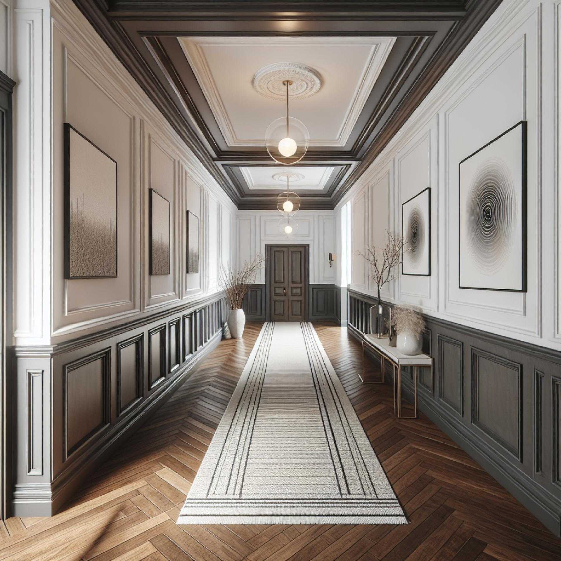 Modern Classic Corridor with Polyurethane EleganceThis modern corridor design demonstrates how polyurethane details elevate interiors, blending classic design with contemporary sensibilities. The walls are composed of geometric panels outlined with thin moldings, each creating balanced rectangular motifs that add rhythm and symmetry to the composition.The ceiling features deep layered frames, decorated cornices, and ornamental edges where soft shadows animate the relief. These architectural details recall classical interiors of the 19th century, yet their precise execution maintains a modern clarity. A short historical note: such ceiling and wall moldings were rooted in neoclassical traditions, where clean geometry framed luxurious interior spaces.The flooring is arranged in a chevron pattern, giving dynamic linear direction that contrasts with the orthogonal wall and ceiling geometry. This decorative flooring detail creates visual continuity in the corridor's perspective, guiding the viewer naturally toward the entry doors at the far end.Color contrast between the dark central wall sections and the light framing moldings intensifies the depth effect, while wall sconces with spherical shades provide soft illumination that emphasizes relief and ornament. Subtle furnishings, including a compact console and cushioned seating, are kept minimalistic so the layered paneling and molding motifs remain at the forefront.Symmetrical polyurethane frame details define the walls and ceiling.Chevron flooring introduces warmth and a sense of motion.Classic and modern aesthetics are harmonized through proportion and ornament.Lighting highlights detail without overwhelming the design.This corridor demonstrates how polyurethane craftsmanship allows complex, refined detailing with practical durability, proving ideal for creating modern interiors infused with classical spirit. This corridor design showcases a modern classic approach with polyurethane details framing the walls and ceiling. The balance of dark and light panels creates depth in the narrow passage. Chevron flooring introduces warmth and fluidity to the geometry. Wall sconces add gentle illumination along the framed motifs. The ceiling is adorned with layered rectangular compositions. Decorative cornices strengthen the vertical and horizontal split. Subtle furnishings complement the grand backdrop of paneling. Neutral tones highlight the refined lines of the decorations. The ornaments reflect a neoclassical visual heritage. Symmetry plays a central role in this concept. Every frame and edge appears carefully structured. The transition from floor to ceiling is elegant and precise. This design merges modern restraint with classic luxury. It demonstrates durability combined with artistry. The corridor becomes not only functional but also a refined aesthetic journey.