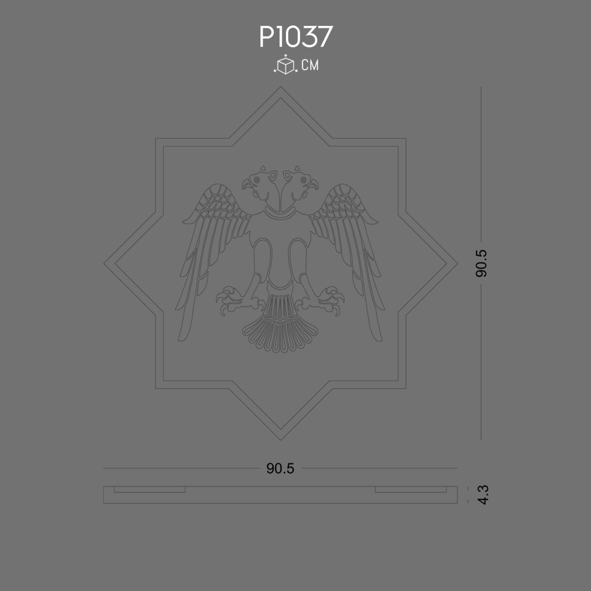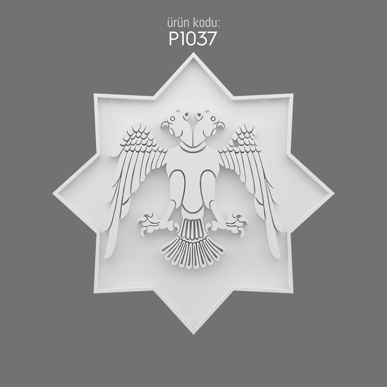 The P1037 relief is a refined decorative polyurethane piece featuring the Seljuk star and the double-headed eagle. Every line and curve has been carefully rendered to highlight both geometry and symbolism.