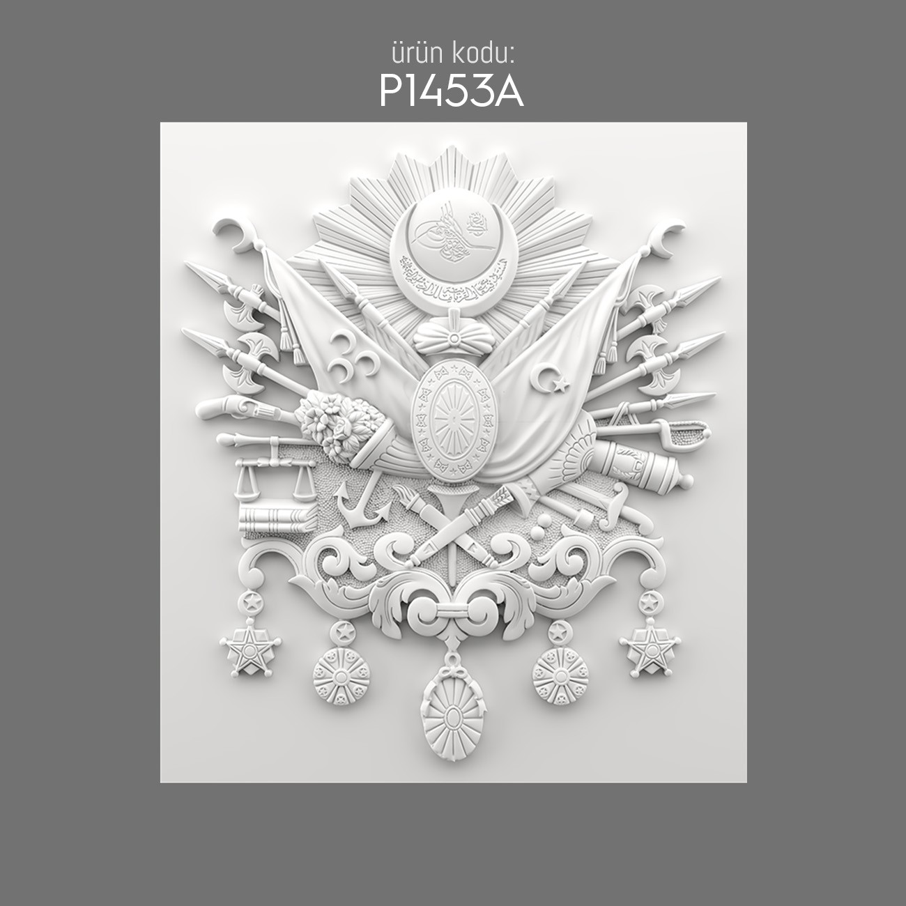 The P1453A Relief is a decorative masterpiece that captures the ornate symbolism of the Ottoman coat of arms. Featuring layered banners, intricate weaponry, scales of justice, anchors, and radiant motifs, this work is a vivid example of how relief design merges artistic detail with symbolic storytelling.