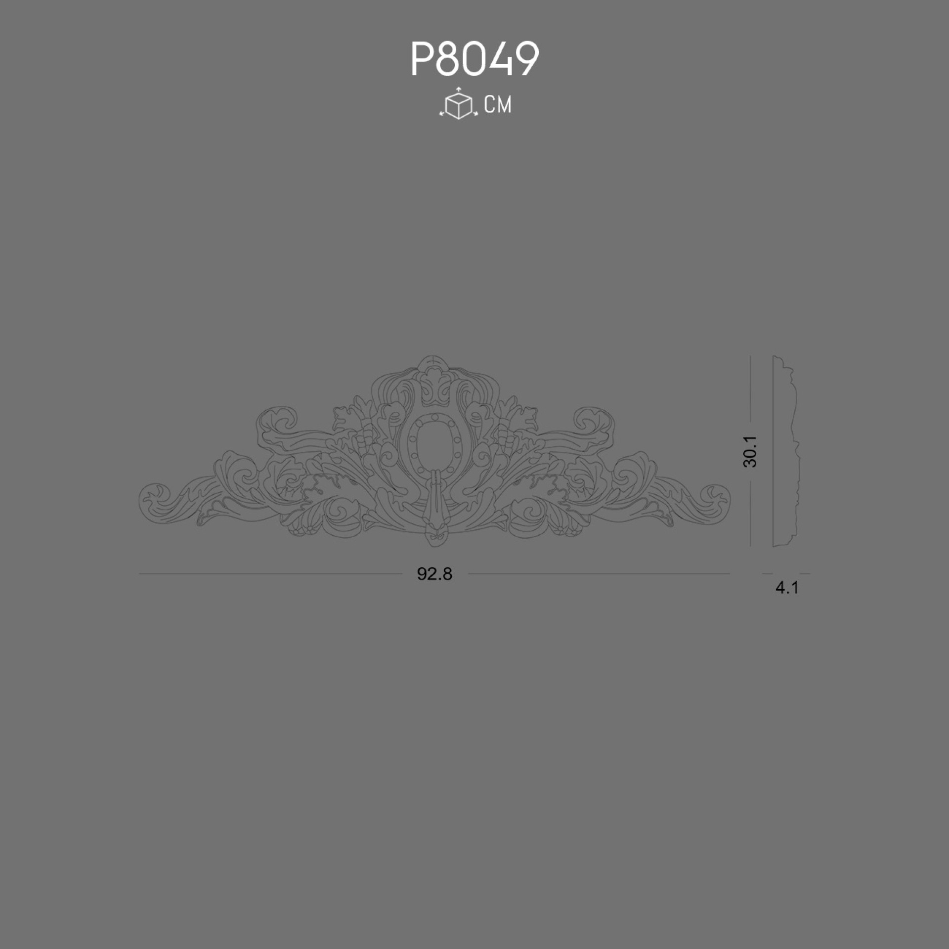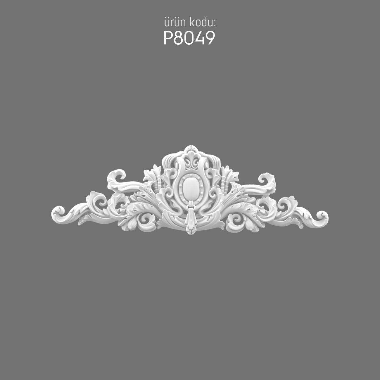 The P8049 polyurethane crown stands out with its refined carving, featuring flowing scrollwork and a central medallion framed by ornamental motifs. Its design reflects influences from baroque and rococo styles, combining bold curves with structured symmetry. Crafted from lightweight yet durable polyurethane, it offers both practicality and decorative sophistication.