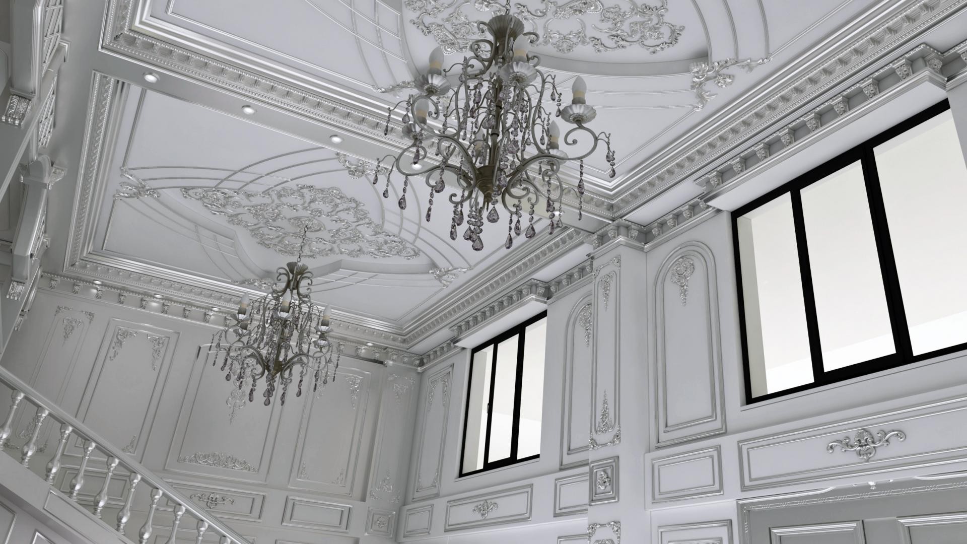 Ornamental Sophistication in Polyurethane InteriorsThe use of polyurethane in classical interiors has transformed the way decorative elements are integrated into modern spaces. This material enables high precision in geometric compositions while allowing for the fine detailing achieved in ornamental reliefs and floral motifs. The result combines durability with timeless artistry.The ceiling in this design presents elaborate medallions bordered by linear grooves and floral curves. Fine acanthus-like motifs recall ancient Greek and Roman traditions, where decorative ceilings and architectural moldings defined prestige. Here, these traditions are reimagined in a contemporary material with enhanced flexibility and endurance.Wall panels are richly framed with raised reliefs, creating a sophisticated rhythm across the surface. Cornices extend downward with finely carved dentils and scrollwork patterns, emphasizing symmetry and continuity. These elements echo the precision of Neoclassical compositions, infused with intricate yet disciplined ornamentation.The chandeliers suspended from the ceiling serve as a focal point, with crystal drops refracting light across the decorated panels. Their metallic curves contrast with the crisp white polyurethane reliefs, enriching the sense of balance between luxury and restraint in the environment.Historical Context and Modern AdaptationOrnamentation of this type draws inspiration from Renaissance palazzos and Baroque residences, where ceilings and walls were enlivened with intricate reliefs. Polyurethane enables these classical flourishes to be recreated with ease, preserving the decorative complexity while ensuring modern efficiency during installation.By harmonizing ceiling medallions, wall panels, and chandeliers, this approach represents a true celebration of interior design rooted in history yet adapted for contemporary spaces. This interior design highlights the timeless qualities of polyurethane elements in classical architecture. The ceiling medallions showcase balanced geometric forms combined with delicate floral reliefs. Ornamental wall panels repeat motifs that emphasize rhythm and elegance. Cornices with dentil patterns add structural refinement and depth. Chandeliers with crystal drops contribute an additional layer of luxury. The harmonious use of relief and symmetry creates visual balance. Decorative motifs echo Renaissance and Baroque traditions. Polyurethane allows precise execution of architectural details. The material supports durability with artistic richness. Precision in moldings connects tradition with modern function. Surfaces display a disciplined decorative language. Adaptability makes designs accessible for many spaces. The result is timeless and stately without excess. Every element supports the overall classical interior vocabulary. Symmetry, ornamentation, and nuanced composition embody elegance and cohesion.