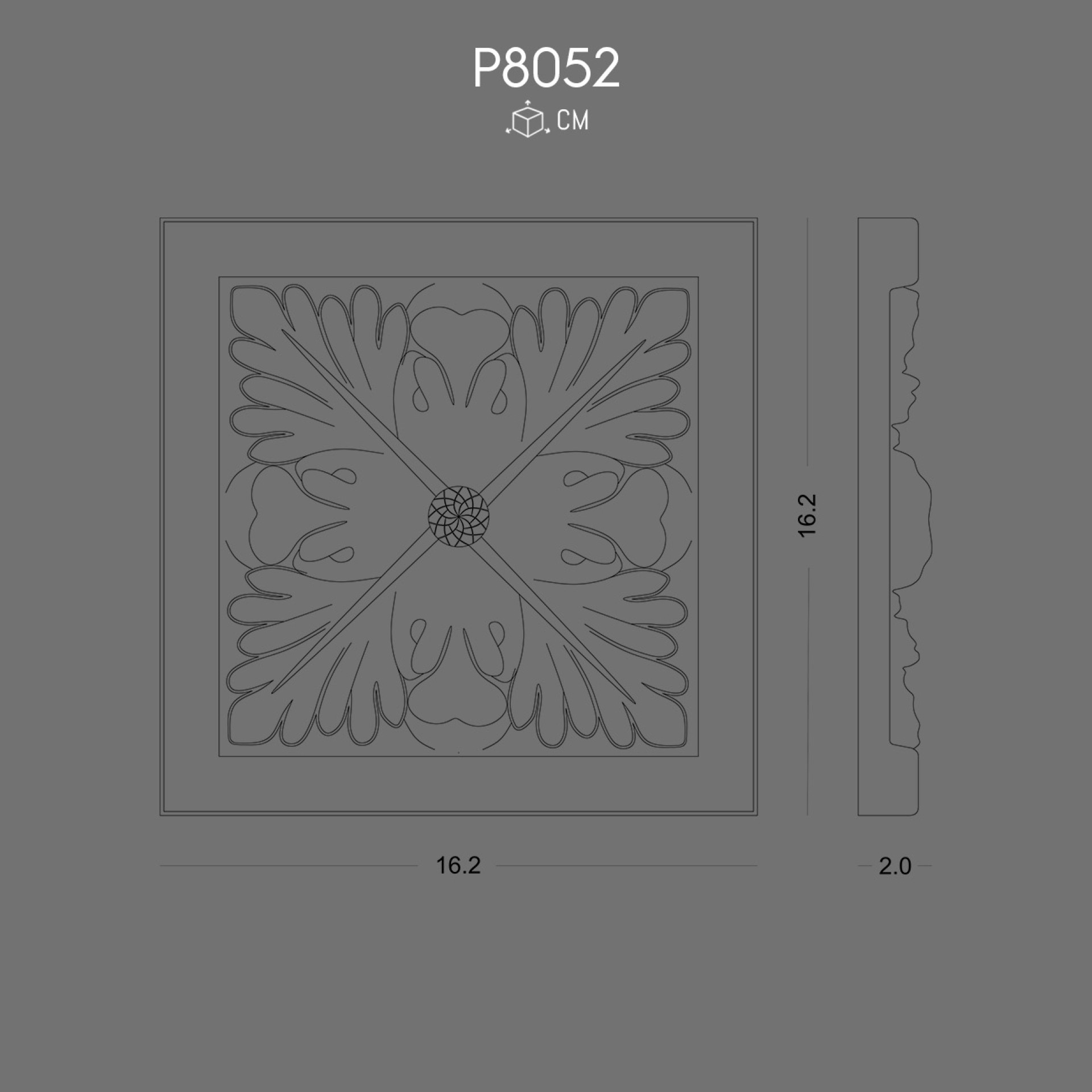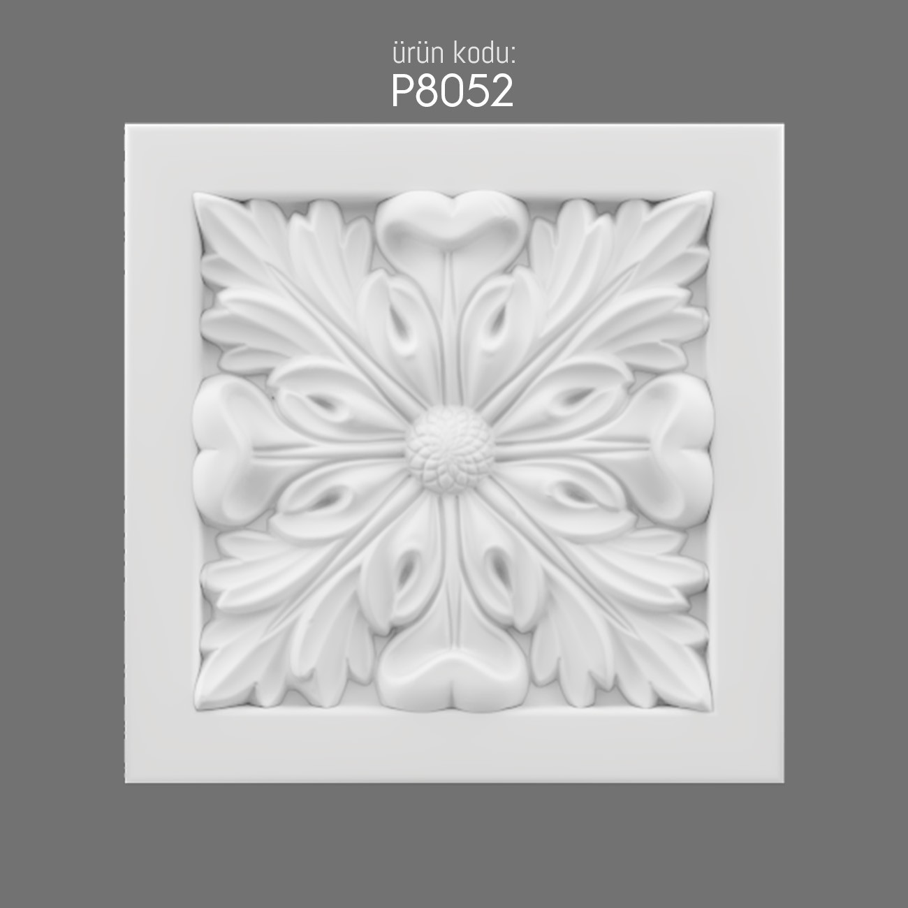 The P8052 Polyurethane Ornament showcases a classical motif that combines leaf and petal shapes radiating from a central rosette. Its square frame emphasizes order and geometric strength. The carefully sculpted curves create harmony, echoing traditional decorative principles used in historic interiors.