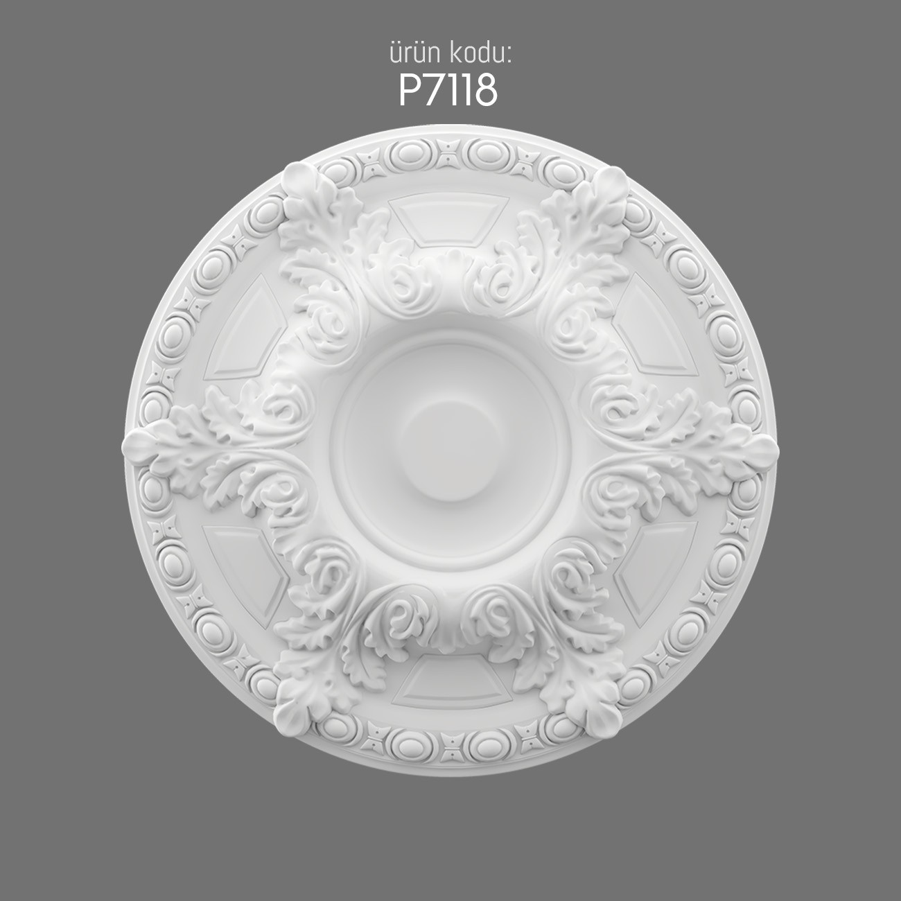 The P7118 model of Ceiling Medallions and Rosettes combines detailed craftsmanship with durable polyurethane material, offering an elegant solution for interior decoration. Ceiling Medallions and Rosettes have long been used to highlight the center of ceilings, traditionally surrounding chandeliers or lighting fixtures. An anecdote often recalled is how these ornate pieces once served to disguise the soot marks from candles and oil lamps in European interiors. This particular design features intricate acanthus leaves and geometric framing, giving it a classical touch, while remaining adaptable to modern spaces. Ideal for homes, hotels, or historic restorations, the P7118 enhances ceilings by creating refined focal points. Its circular geometry and high-relief motifs elevate the perception of depth, while the smooth polyurethane surface ensures both durability and ease of installation. Perfect for those seeking timeless detail, it transforms a plain ceiling into an artistic statement of elegance.