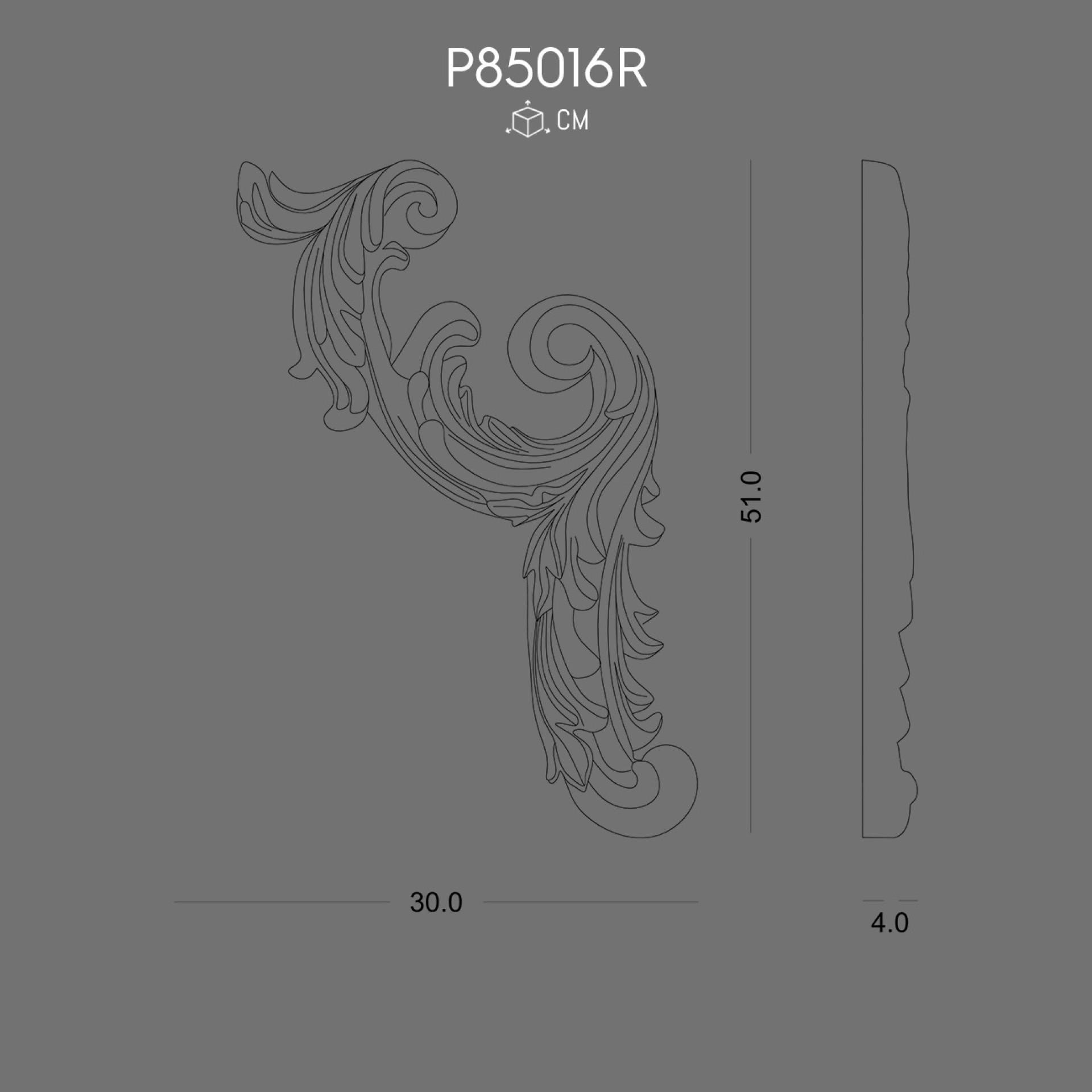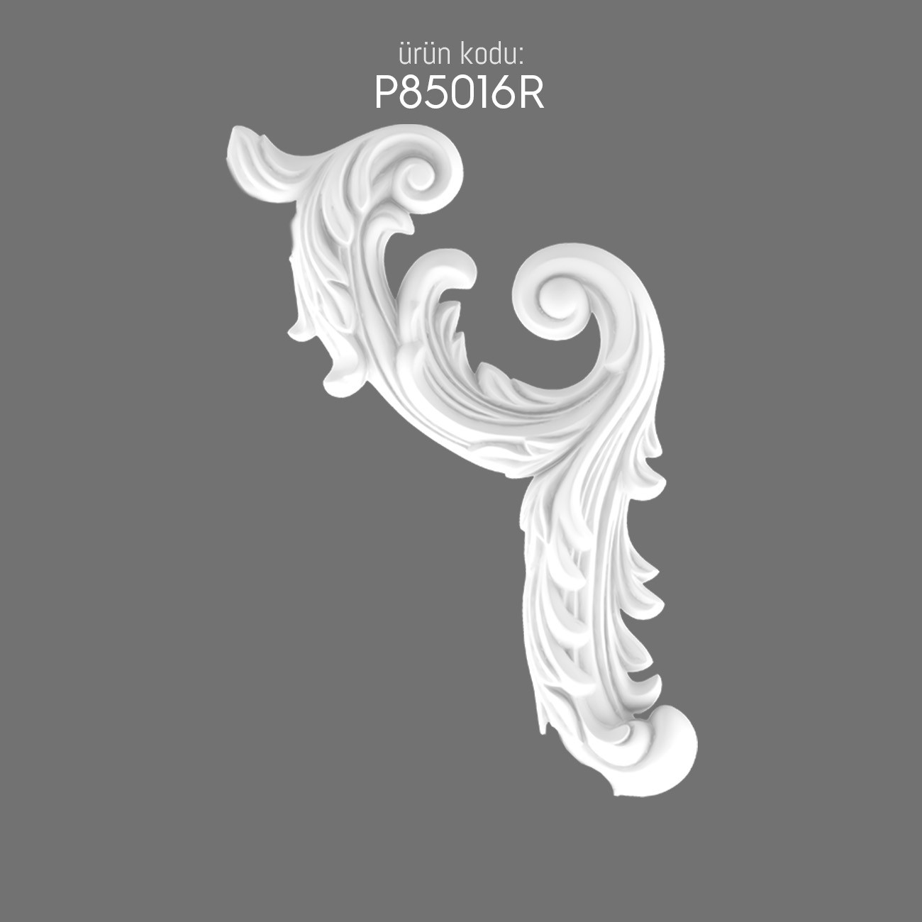 The P85016R Decorative Moulding Corner in polyurethane brings a refined classical charm to interior spaces. Its swirling leaf and scroll motifs echo the curves seen in Baroque and Rococo architecture, transforming a plain corner into an elegant focal point. Many centuries ago, ornate corner embellishments were employed to enhance palaces and villas with symbolic artistry. Today, this design brings the same sense of refinement into modern interiors while remaining lightweight and easy to install thanks to polyurethane material. A short story tells of a craftsman in the 18th century who spent days carving a similar swirling motif into a wooden panel, only for it to be admired for generations; the P85016R makes that timeless look accessible in contemporary applications. Its smooth white surface is suitable to be painted, allowing customization for unique projects. Whether placed in living rooms, hallways, or formal receptions, the piece enriches walls with a harmony of curves that seem to flow naturally. This corner model is especially useful for enhancing moulding frames around ceilings, doors, and decorative panels. Polyurethane offers durability while maintaining crisp detailing in each curl and groove. Designers often use such corners to build a layered composition that draws the eye upward, creating the illusion of grandeur in interior design.
