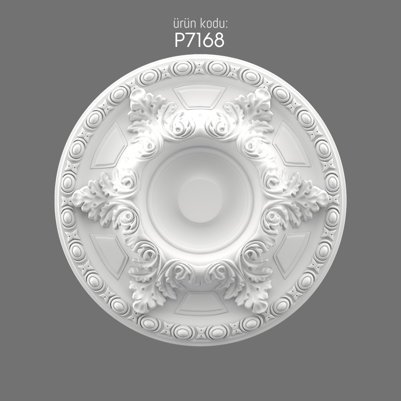 The P7168 model showcases intricate floral motifs, including acanthus leaves arranged with geometric precision. Its circular design, enriched with repeated patterns, makes it a striking focal point in interior decoration. Crafted from high-quality polyurethane, it provides both durability and lightness, ensuring easier installation compared to traditional plaster medallions.