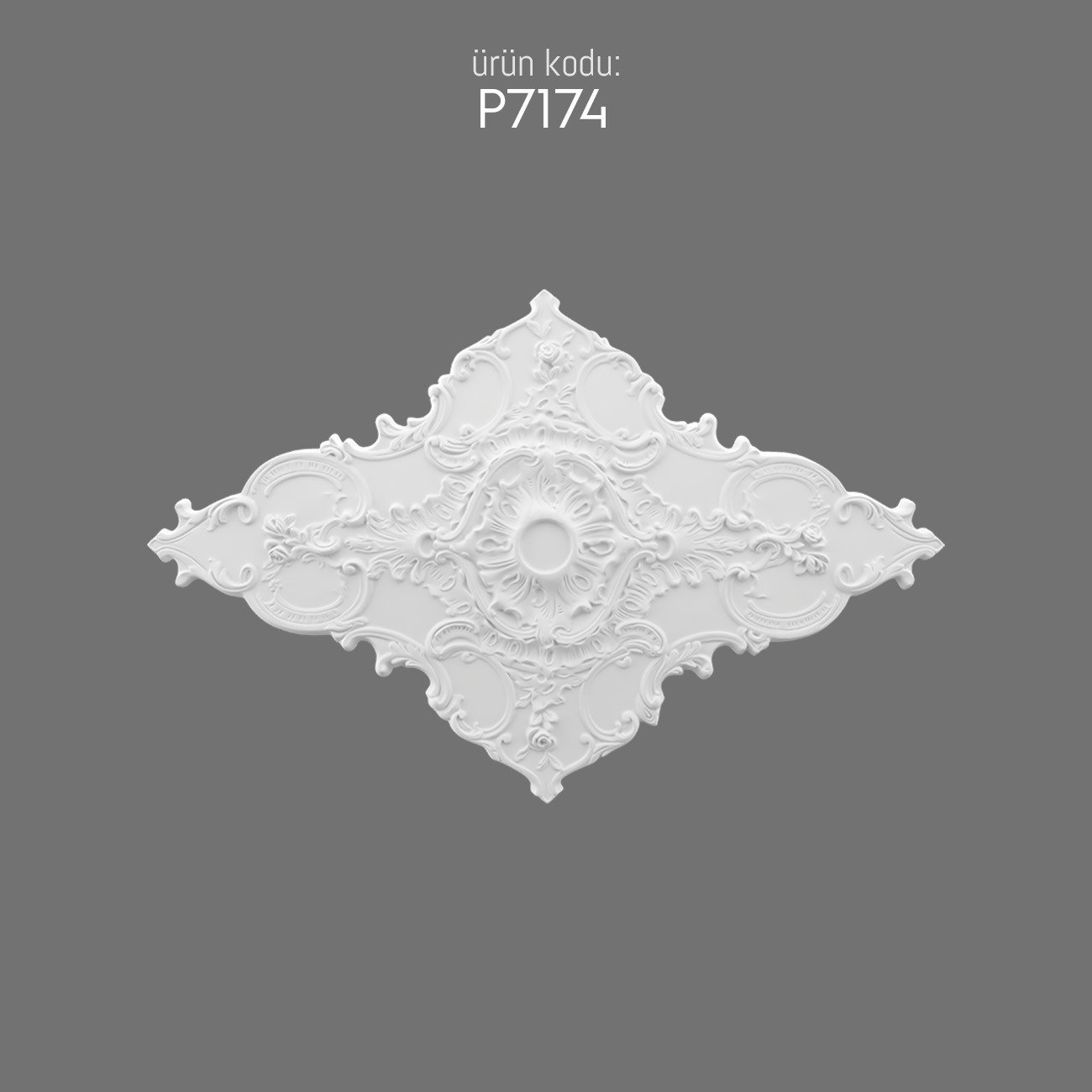 The P7174 model is a decorative ceiling element designed with rich baroque-style motifs. Its diamond-shaped symmetry creates a sense of balance, while its detailed patterns of scrolls and foliage add depth and elegance.