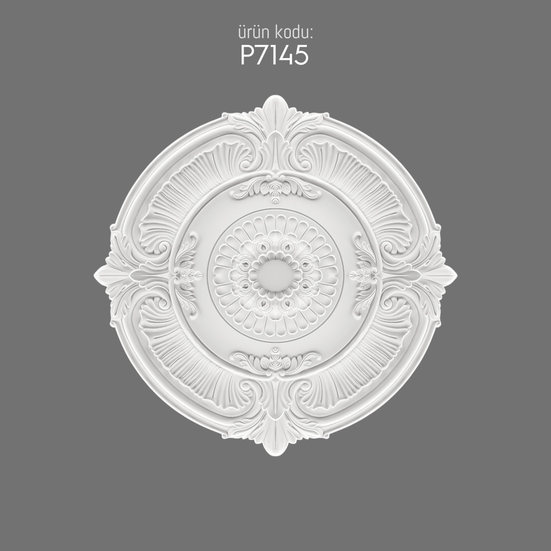 The P7145 is a finely crafted piece that transforms interiors with decorative impact. Its circular form is elaborately detailed with layered floral petals at the center, surrounded by sweeping leaf motifs that extend symmetrically toward the edges. The combination of these elements gives balance, texture, and depth to any ceiling.