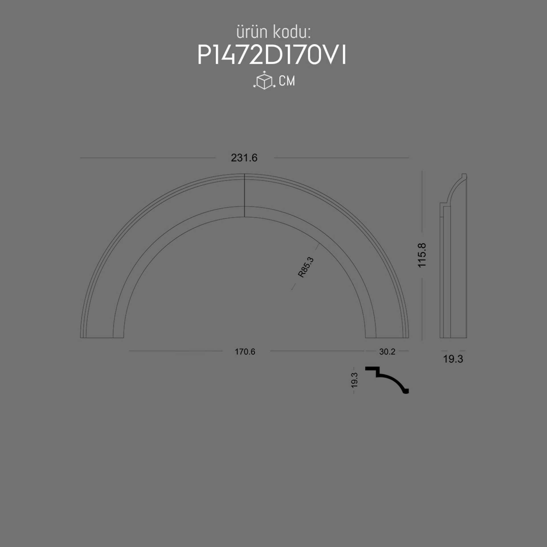 The P1472D170VI is designed as a refined polyurethane element that enhances the aesthetic appeal of both interior and exterior architectural projects. With its 170 cm dimension, it is specifically created as an arched crown compatible with door and window arches, delivering balance between durability and decorative style.