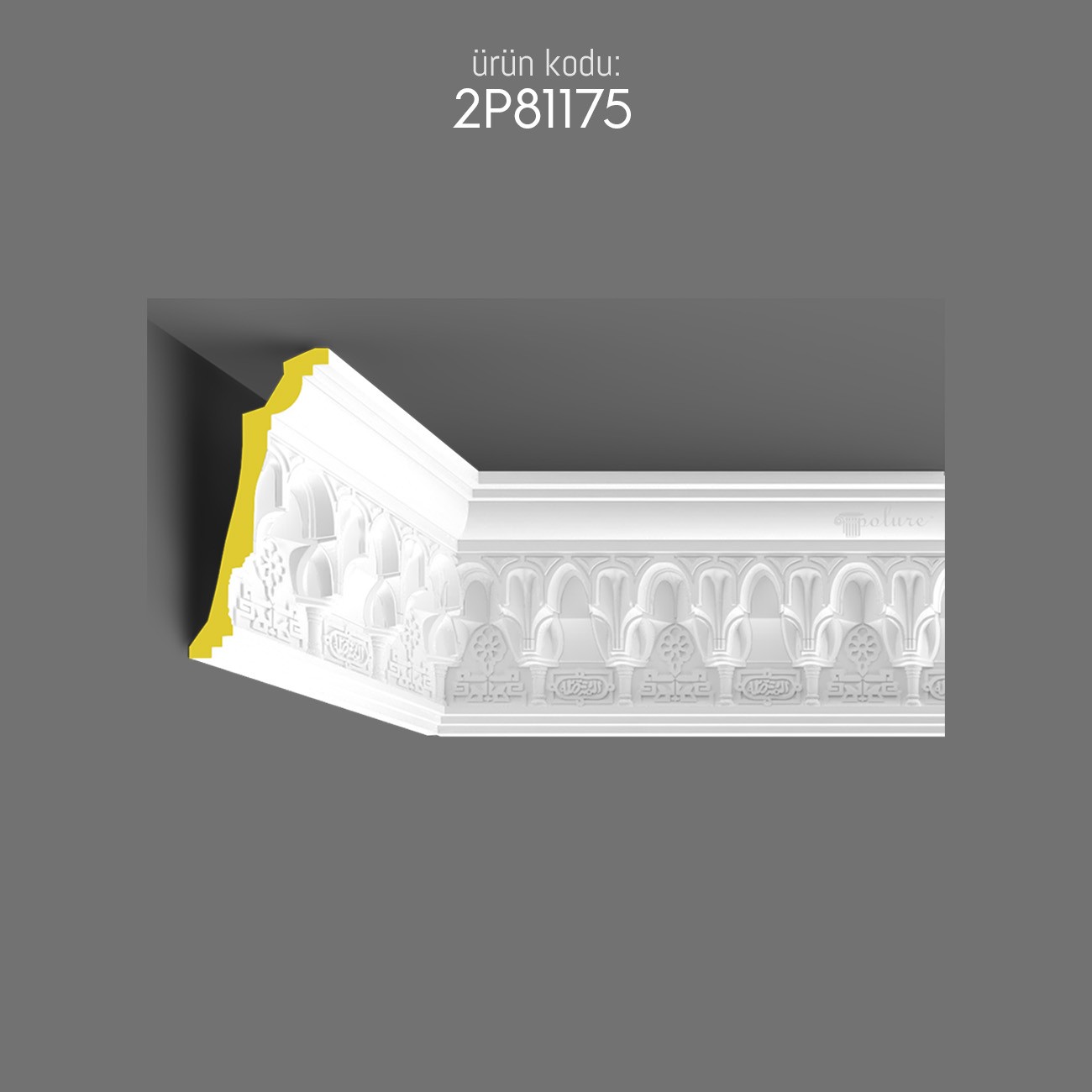 The 2P81175 Decorative Cornice showcases a refined relief design with repeating arches and geometric motifs. It is made from durable polyurethane, ensuring both protection for ceilings and long-term style for interiors. The fine carving details evoke a sense of architectural heritage and elevate the atmosphere of a room.