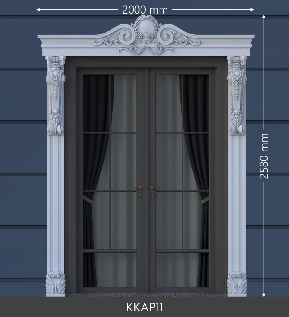 The polyurethane material of the KKAP11 moulding provides durability and decorative flexibility for modern entryways. Its detailed ornamentation features scrollwork along the top crown and finely worked motifs along the sides.