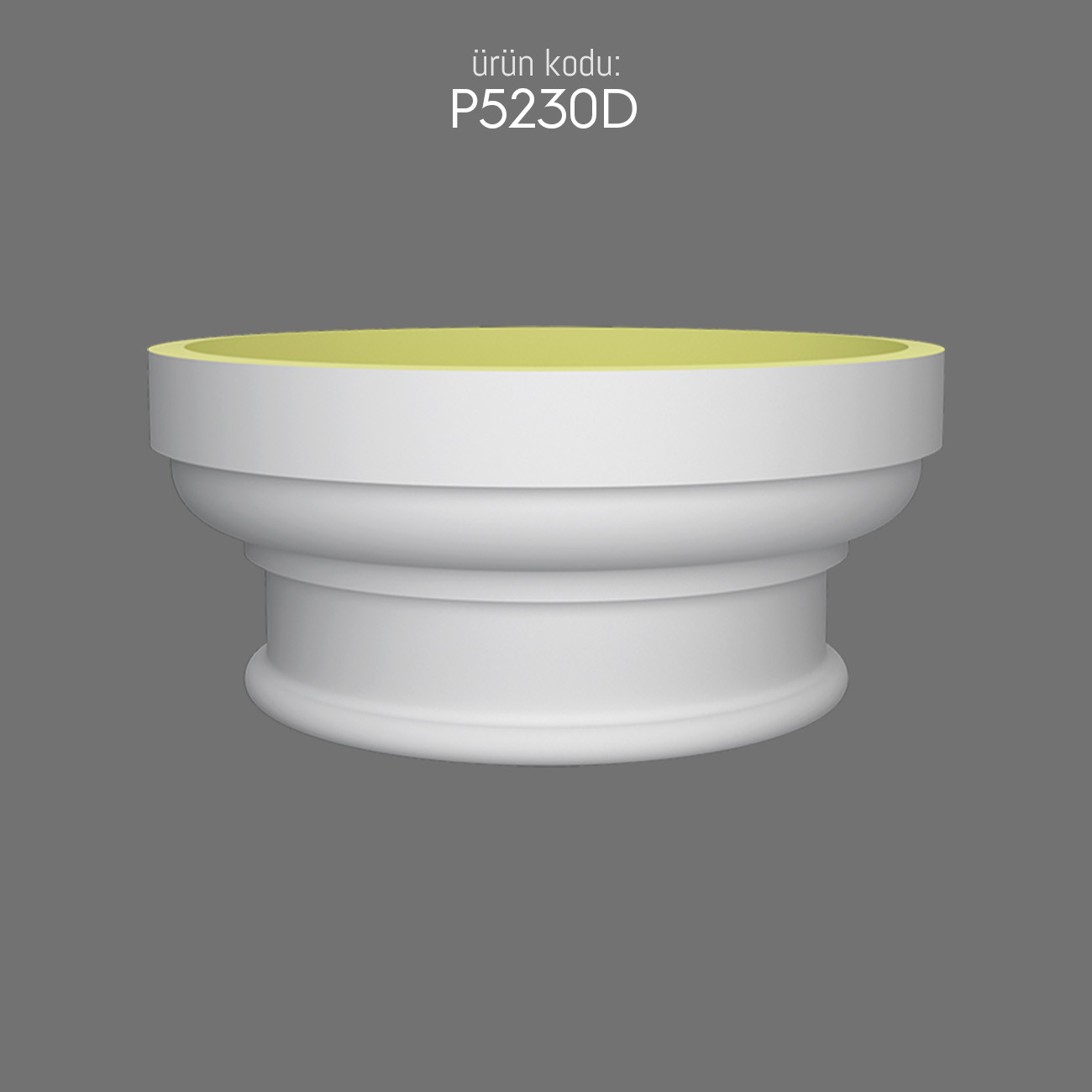 Il capitello in poliuretano P5230D è progettato con un profilo arrotondato che richiama le classiche proporzioni delle architetture tradizionali. La sua superficie liscia e regolare lo rende ideale per ambienti che desiderano un tocco di eleganza senza eccessivi ornamenti.