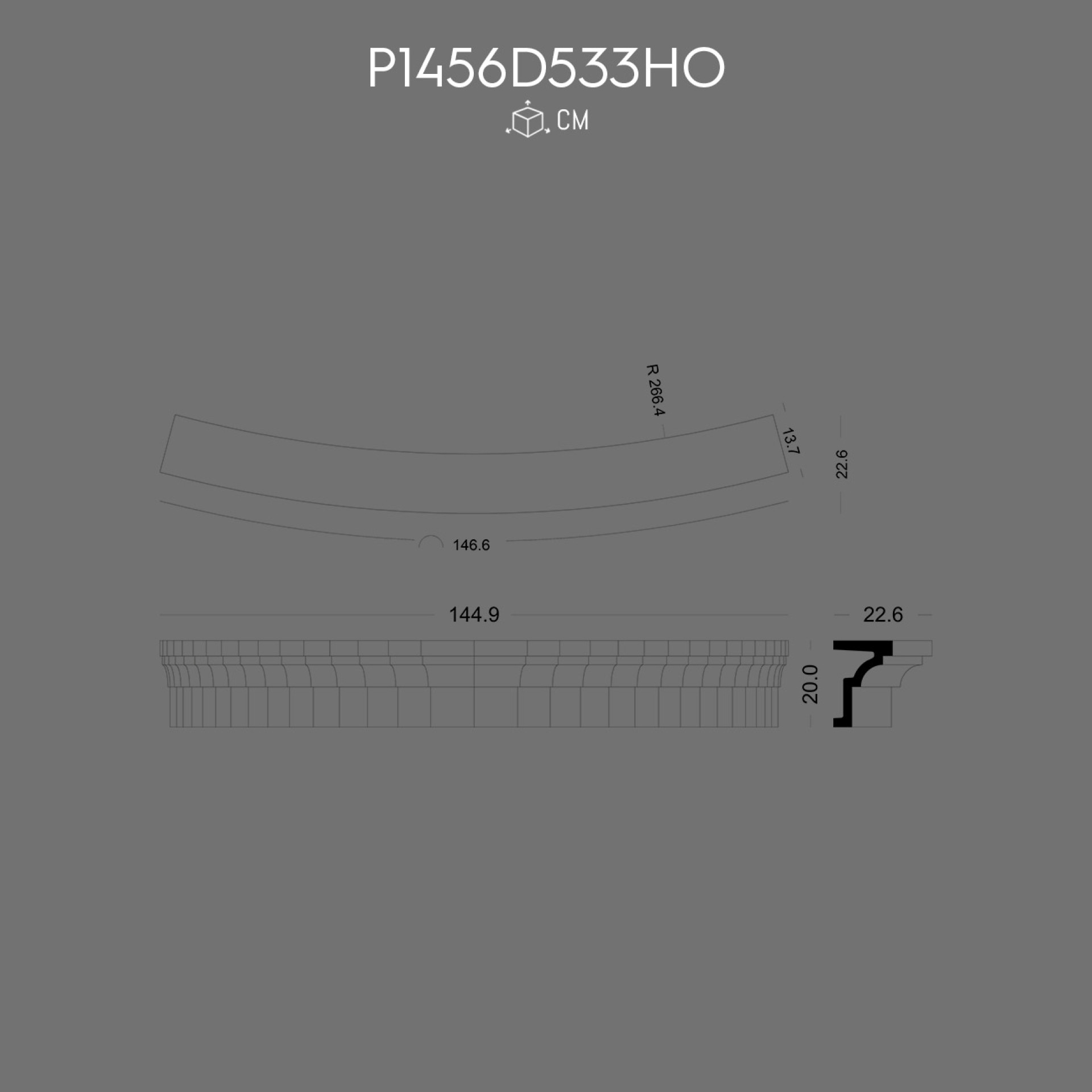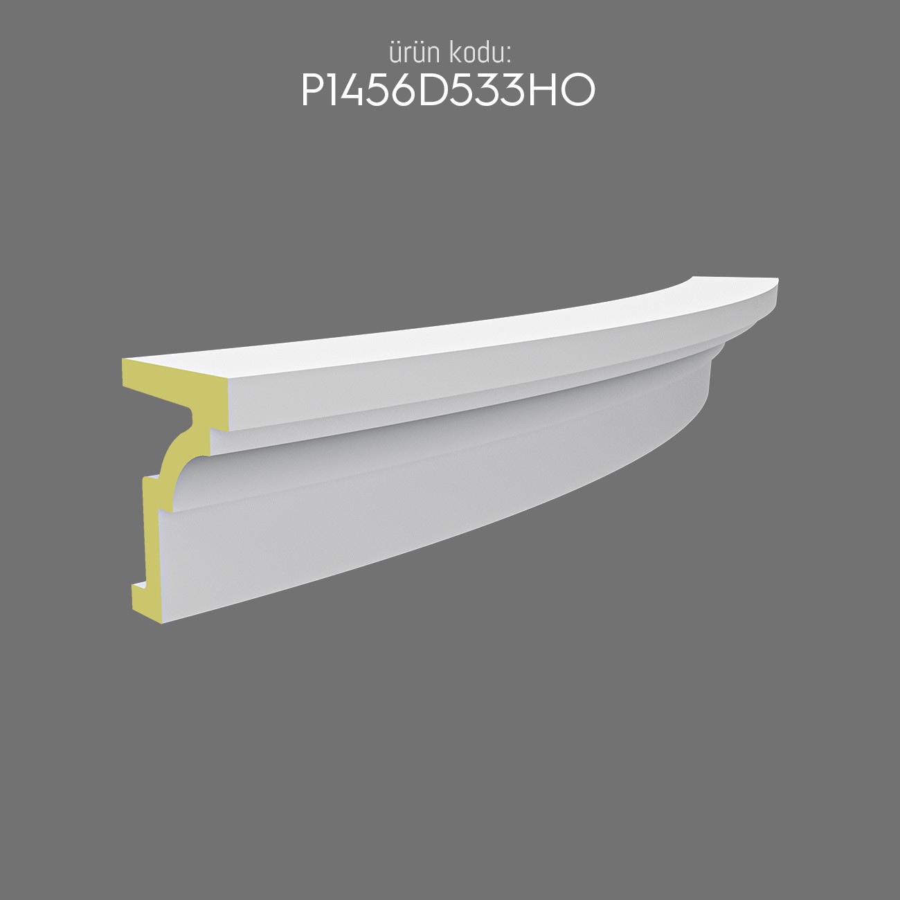 O modelo P1456D533HO cornija arredondada para arco de porta e janela 533 cm é desenvolvido em poliuretano de alta qualidade, oferecendo resistência e um acabamento sofisticado para aplicações arquitetônicas em ambientes internos e externos.